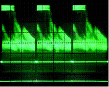 圖2是無(wú)Z軸亮度調(diào)制較老數(shù)字示波器的顯示。雖然該示波器甚至在5ms/div時(shí)仍有捕獲信號(hào)細(xì)節(jié)的足夠采樣率和存儲(chǔ)器深度但所有捕獲點(diǎn)的顯示亮度相同。這就在視覺上丟失了信號(hào)包絡(luò)內(nèi)的波形細(xì)節(jié)。因此在選擇模擬示波器技術(shù)還是選擇較老的數(shù)字顯示技術(shù)上不應(yīng)對(duì)今天視頻實(shí)驗(yàn)室中充斥模擬示波器感到驚奇!