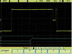 當(dāng)您觀察復(fù)合調(diào)制模擬信號(hào)如前述組合電視信號(hào)和馬達(dá)驅(qū)動(dòng)信號(hào)時(shí)數(shù)字示波器亮度分級(jí)能力具有鮮明的視覺效果。在您調(diào)試數(shù)字電路時(shí),亮度等級(jí)對(duì)于發(fā)現(xiàn)信號(hào)異常也極端重要。圖6是發(fā)現(xiàn)嵌入在脈寬調(diào)制信號(hào)(PWM)中矮脈沖的例子?拷魍话l(fā)中心處的亮點(diǎn)表明示波器已捕獲到信號(hào)異常。通過(guò)在一個(gè)亮點(diǎn)上放大我們能清楚看到如圖7所示的信號(hào)異常細(xì)節(jié)。雖然模擬示波器也能通過(guò)重復(fù)掃描顯示亮點(diǎn)但模擬示波器不能保存和放大波形。