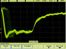 同樣由于不同時(shí)間的馬達(dá)起動(dòng)信號(hào)屬單次應(yīng)用傳統(tǒng)模擬示波器技術(shù)也不能充分捕獲和顯示這些波形。把一臺(tái)模擬示波器設(shè)置為以100ms/div掃描捕獲單次信號(hào)您會(huì)觀察到一條垂直光帶在一秒內(nèi)掠過(guò)示波器顯示。由于傳統(tǒng)模擬示波器沒(méi)有存儲(chǔ)能力因此放大保存波形是不可能的。