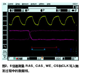 如圖2所示16條邏輯定時(shí)信道用來(lái)設(shè)置在RAS高、CAS低、WE高和CS上觸發(fā)系統(tǒng)。示波器信道1用來(lái)察看和抽換法時(shí)鐘的上升沿。在邏輯分析儀和示波器組合解決方案中邏輯分析儀只能交叉觸發(fā)示波器或反之與此不同混合信號(hào)示波器可以在示波器和邏輯定時(shí)信道中進(jìn)行全寬觸發(fā)。