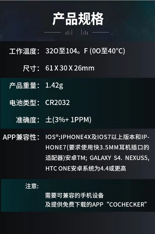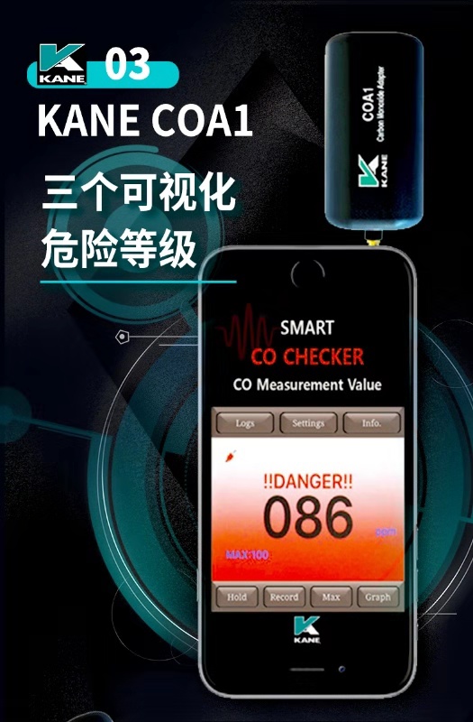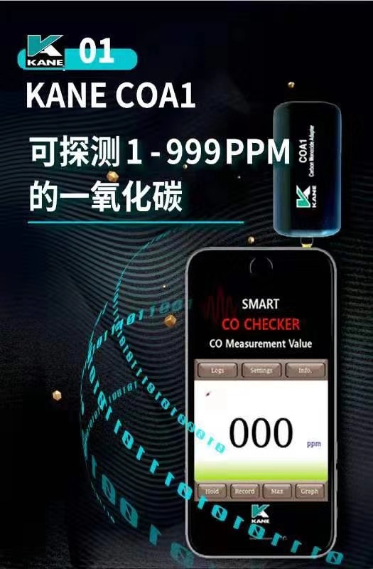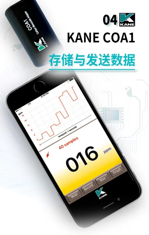 英國(guó)KANE凱恩手機(jī)銜接一氧化碳探測(cè)儀 KANE COA1 一氧化碳探測(cè)儀 手機(jī)銜接解決方案 • 可探測(cè)一氧化碳至1ppm • 一氧化碳讀取至999ppm • 與iOs或安卓系統(tǒng)兼容 • 可在免費(fèi)APP上顯示3個(gè)危險(xiǎn)等級(jí) • APP上可以保存數(shù)據(jù)和發(fā)送郵件數(shù)據(jù) • 工作溫度:32O至104℉(0O至40℃) • 準(zhǔn)確度:±(3%+1PPM